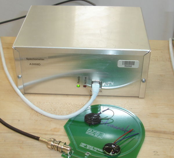 All versions of the A3008 suffer from a +0.2 MHz/°C shift in measured frequency with ambient temperature. This shift occurs as the VCO frequency changes by −0.2 MHz/°C. We must let the spectrometer warm up for a few minutes to allow it to reach equilibrium. The A3008/C/D flashes its geen power light until the circuit has warmed up. The red light turns on when the A3008B/C/D is in use. The A3008E, however, does not provide a warm-up indicator, because our assumption is that the spectrometer is always powered up and warm.