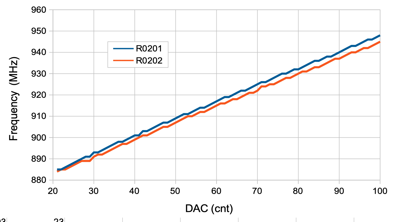 The steps in the calibration are due to the resolution of the hand-held spectrometer. Our objective is to obtain a good calibration of the spectrometers at a reference frequency 915 MHz, combined with an accurate slope. For R0201 we have dac_ref 58.0 cnt and slope 0.796 MHz/cnt. For R0202 we have dac_ref 60.8 cnt and slope 0.772 MHz/cnt. With our calibration of R0201 we see that our eariler demodulator sweep was 842-948 MHz.