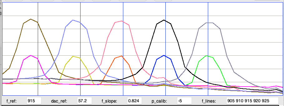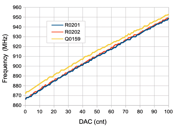 The steps in the calibration are due to the resolution of the hand-held spectrometer. Our objective is to obtain a good calibration of the spectrometers at a reference frequency 915 MHz, combined with an accurate slope. For R0201 we have dac_ref 57.2 cnt and slope 0.824 MHz/cnt. For R0202 we have dac_ref 60.8 cnt and slope 0.772 MHz/cnt.