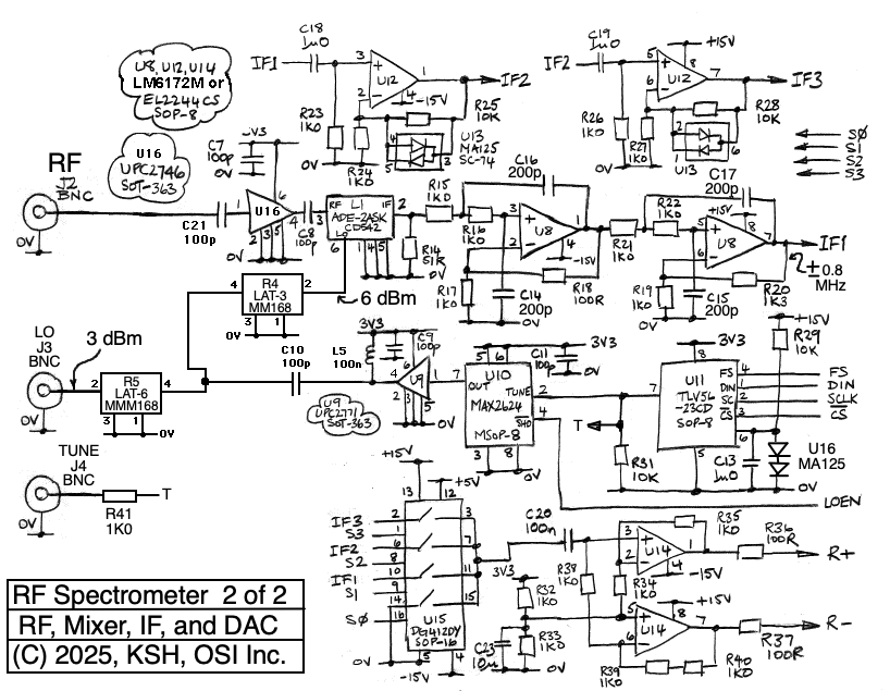 The new RFPM Instrument operates the A3008E, but is incompatible with the A3008D and earlier versions. So far as we know, there is only one A3008 in the field, at Edinburgh University. We have three in-house. We will update them all and drop support for the A3008A-D in LWDAQ 10.7.5. Because the DAC write is faster, the A3008E is faster at taking spectra. When measuring power, the RFPM does not use a constant LO value, but intead makes use of a sweep of "dither+1" steps with dwell time "dwell+1" microseconds. Our initial values are dither=1 and dwell=3. With the dither in the LO, we eliminate the occasional zeros in power measurement that occur when our source is in phase with our LO. We also increase the width of the spectrometer window. So will increase the capacitors in the IF filter from 100 pF to 200 pF, which will drop the corner frequency of the four-pole Butterworth filter from 1.6 MHz to 0.8 MHz. The window will now be 1.6 MHz. With our dither of 1 MHz, the effective window will be 2.6 MHz, slightly smaller than our original 3.2 MHz. New second page of schematic is S3008C_2.gif. We produce but do not test P3008B02, which drops DAC update time from 1.85 to 0.925 μs and adds a flash of LED2 for each command reception.