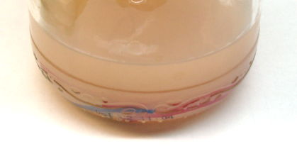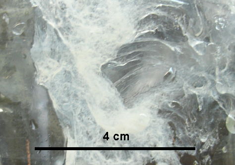 When we wash the jar with water, we get a sudden appearance of a thick, rubbery, white residue, as shown below. In the days before we recommended the double-wash in clean acetone before re-implantation, we received reports from several customers that leads and transmitters soaked in acetone were causing dessication and infection of neighboring skin. With the double-wash in clean acetone, we have received no further reports of such dessication and infection.