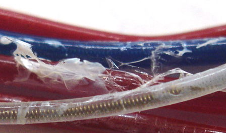 Resistance of the conductor equipped with wires in the photograph was ≤100 mΩ, which is the resolution of our DVM. We conclude that 300,000 cycles did not increase the resistance of the leads above a fraction of an Ohm, nor did it tear the silicone.