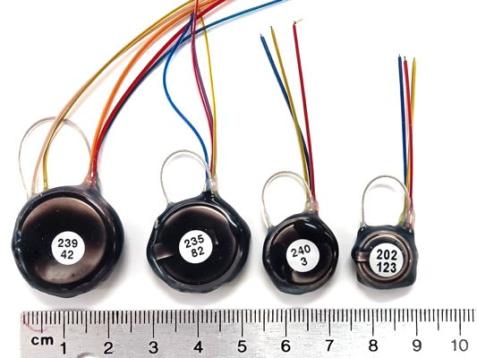 The A3048 SCTs are a family of single-channel sensors. The A3048P is our smallest sensor with mass 1.5 g and thickness 3.7 mm. The A3048S is slightly larger, with mass 1.9 g. The A3048S2, with its 0.2-80 Hz passband and 256 SPS sample rate, is our most popular EEG sensor. The A3049 SCTs are a family of one and two-channel sensors. The smallest A3049 is the A3049W with mass 2.0 g. The largest A3049 is the A3049L with mass 14 g. The A3047 is a one to four-channel SCT that incorporates its own temperature sensor. The mass the A3047A is 6.7 g. The A3040 HMTs are a family one to four-channel head-mounting sensors with mass 2.2 g. All these families of SCTs and HMTs can be configured for both AC and DC recordings.