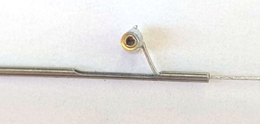 [21-JAN-26] To reach farther into brain, we need a stiff, insulated wire. The wire will come supplied longer than you need. You cut the wire back to the length you require. You can square-cut the end, or you can cut it at an angle so that it has a bevel to better penetrate the brain. When implanting with a subcutaneous transmitter (SCT), we run the SCT lead along the surface of the skull to the electrode and attach the lead to the electrode either with a crimp contact or a socket contact. During surgery, the depth electrode must be held firmly while we make this contact. Afterwards the electrode must be maneuvered into the correct location on the skull and lowered to the correct depth.