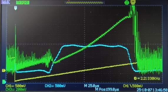 We try C18 = 0 pF with R25 omitted. We see the same demodulation sweep amplitude as for C18 = 10 pF with R25 omitted, but when we apply an SCT signal, the rise time is around 100 ns.