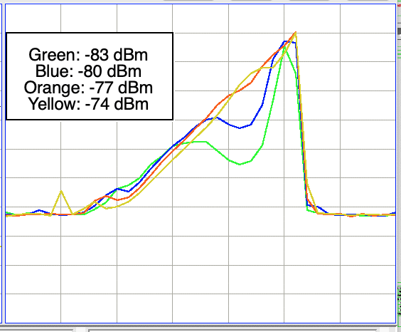 When we drop the sweep to −56 dBm, we must wait until 929 MHz interference dies down to −69 dBm before taking our photograph.