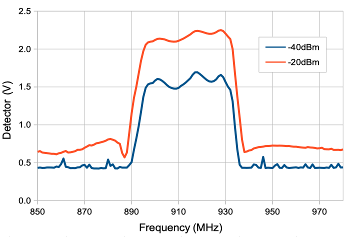The above signal is similar to the traces we see in our downshifting receivers. We repeat our frequency sweep to see again the tuning response. We now have D going from 0.2 to 0.9 V in the band 894-936 MHz.
