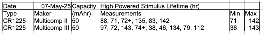 [12-MAY-25] Our batteries have delivered 1184, 537, and 1037 of our 90-pulse stimuli. The devices provided 30, 13, and 26 hours. The 100-ms pulses seem to wear out the battery at about the same rate as the 10-ms pulses. Battery voltage with 10-kΩ load is 2.92 V, 2.88 V, and 2.96 V. With 1-kΩ load 2.64 V, 2.60 V, and 2.72 V.