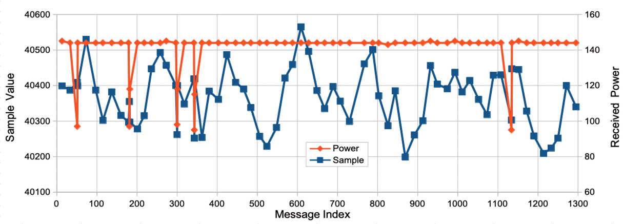 The main message stream has power around 140 counts. Two of these high-power messages are missing. In onc case, there is no other message to take its place. In the other case, its place is taken by a much lower-power message. We see seven, low-power extra samples. These arrive at the same time as higher-power competitors, but they do not have exactly the same value. They are corrupted versions of the high-power message received by a more distant antenna. The corruption has affected only the least significant byte of the message. During reconstruction of the signal, these lower-power samples will be dropped in favor of their higher-power competitors.