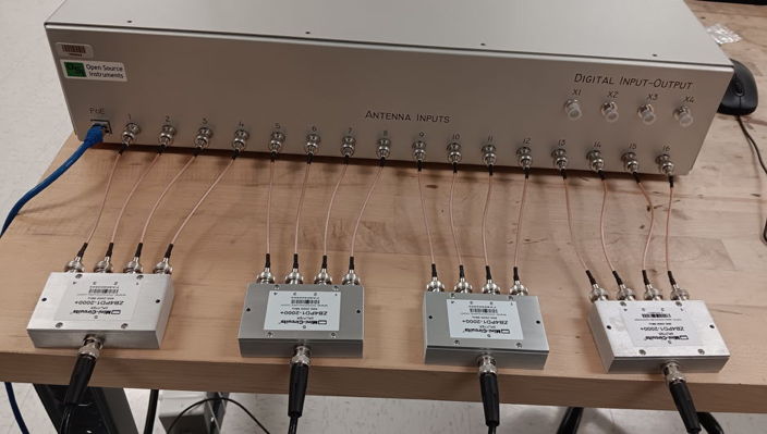 [15-OCT-25] We have two TCBs assembled: Y71073 and Y71075. The former has all internal cables installed, the latter has three missing cables. We ran out of the 6" and 8" cables today. We check our four SCT test sources. Their center frequencies are 905, 915, 918, and 921 MHz. We replace the battery in the 915 MHz source. Now their output powers, according to our recently-calibrated spectrometer, are about −10 dBm (not the −8 and −7 dBm marked on their chassis). We pass our 918-MHz SCT test signal through 50 dB of attenuation and connect to antenna BNC sockets one after the other. Our signal strength is −60 dBm. We obtain >90% reception in all but four detector modules. We replace the UMCC-UMCC cables of these four and reception rises to >90%. We repeat with −60 dBm centered at 921 MHz and 905 MHz and obtain >90% reception in all inputs equipped with cables. We vary attenuation and find the minimum powers at 905, 915, 918, and 921 MHz for which we obtain >25% reception in all channels is −66, −66, −63, and −66 dBm respectively.
