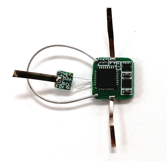 For now, we will stick with 1V2 = 1.2 V. We revert No17 to 256 SPS pressure and 64 SPS temperature. Active current is 259 μA at 25°C. For No19 we have 266 μA at 25°C. We take No17 and cut it loose from programming and sensor extensions, connect sensor with three 125-μm teflon-insulated silver wires to the main circuit, add three battery tabs. Wash and dry. Current consumption the same, but we have to load an antenna.