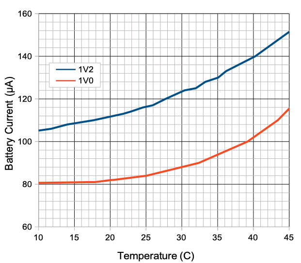 The table above suggests that we can always get the chip to power up at 1.06 V, and after entering standby, the chip will not turn itself off until 1V2 drops to around 0.6 V. If we set 1V2 to 1.1 V, we expect total current from 1V2 to be 160 μA. If our buck converter is 90% efficient converting 3.0 V to 1.1 V, we will draw only 65 μA from the battery at 25°C. Note that we previously saw battery current 140 μA with microprocessor disabled, 177 μA with processor running the BPM code. Our dynamic current consumption, which we do not expect to be a strong function of temperature or VCC, is (177-140) μA * 3.0 / 1.22 / 90% = 100 μA. We must perform the same experiment with the disabled microprocessor to measure static power only.