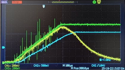 The drop in VB is 1.2 V provides another 12 μC from C1, making the total charge delivered to C2 and C3 equal to 19 μC, which is what we expect. Following the ramp-up, we charge C1 through our current-monitoring resistor. The drop in VB mirrors the rise in the voltage across our 51-Ω resistor. The time constant of the rise in VB and fall in current is roughly 300 μs. We expect 10 μF * 51 Ω = 510 μs.