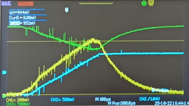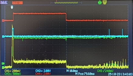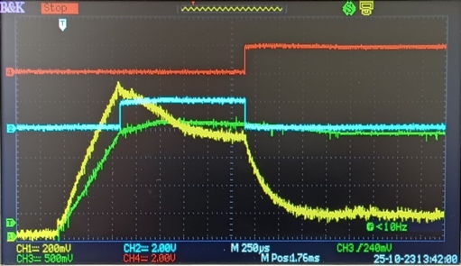 We place a 10-Ω resistor in series with our 2.9-V VB supply and obtain the above traces again, so as to measure the in-rush current at startup.