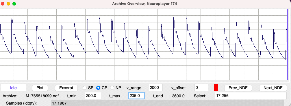 "I am able to get the oscillation graph by setting the Neuroplayer's interval to 0.0625 s, which is the smallest it will go and with which I get about four points per half period. With a 10-Hz oscillation presumably you would get only one or two points per half period which I think would be too few to be able to see the signal well. However, with the Overview feature the pattern can be seen better, but the signal is in ADC counts and not pressure.