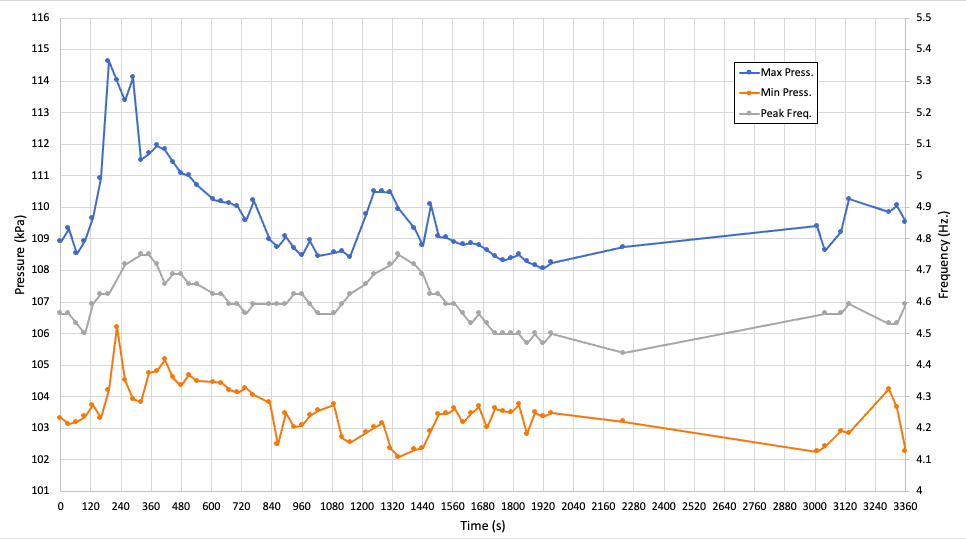 The same processor calculates the maximum and minimum pressure in each interval. We look at thirty-two-second intervals, for which our frequency resolution is 1/32 Hz. Gaps in the data are visible as missing data points. Gaps are the result of telemetry reception being <50%.
