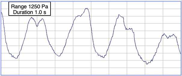 We have several hours of recordings from that day. Telemetry reception is poor in all of them, but in M1765518099.ndf reception is robust most of the time. Whenever reception is robust, we see heartbeat with a sharp step up, a small sharp step down, and a slower relaxation, just like in the following example of five seconds of robust reception. Amplitude is roughly 1000 cntpp = 6.2 kPa. Frequency is 4-5 Hz.