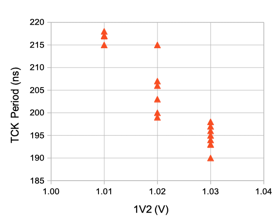 We consider how we might make use of our ability to reduce 1V2 to 1.0 V. Doing so will reduce static current consumption of the logic chip by 30 μA and dynamic current consumption by 40 μA at 25°C. At 37°C the reduction in dynamic current consumption could be as much as 60μA. The problem with dropping the core voltage is the slow-down of the ring oscillator. Right now our self-calibration arrives at a ring divisor of 8, which creates a division by 8 + 1 = 9. The period is around 210 ns. The ring is running at 42 MHz. With 1V2 = 1.0 V, the ring will run at at only 21 MHz. Our choices of TCK period adjustment resolution will be 47 μs, which is more than twice the acceptable range 195-215 ns for TCK. As it is, our resolution is 23 ns, which is already greater than the acceptable range. So this drop does not look feasible while TCK is running.