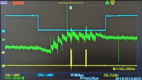 [23-OCT-25] We connect a 51-Ω resistor in series with 0V, ground four probes on 0V, measure the voltage across R_s = 51 Ω with CH1 negated, and put the other three probes on 1V8, TP1 and TP4, these three signals being available on P1. We are working with No17, fully-popluated with A3051D2 firmware 256 SPS pressure, 64 SPS temperature. When we power up No17, we see the supply current increase to 20 mA. At the same time, VB will drop from 3.0 V to 2.0 V. Despite this drop, the buck converters are still able to generate 1V8 and 1V2. After ramp-up of the power supplies, the current relaxes to 16 mA. We see TP1 = TDO go HI and TP4 = TCK go LO. The logic chip is configuring itself. After 1.2 ms, configuration completes. Now TP1 is FHI and TP4 = !SFLAG. We expect FHI to stay LO until a burst transmission occurs. We expect !SFLAG to be asserted when the chip enters its standby state, which will not be until the oscillator has powered up and generated a few pulses.