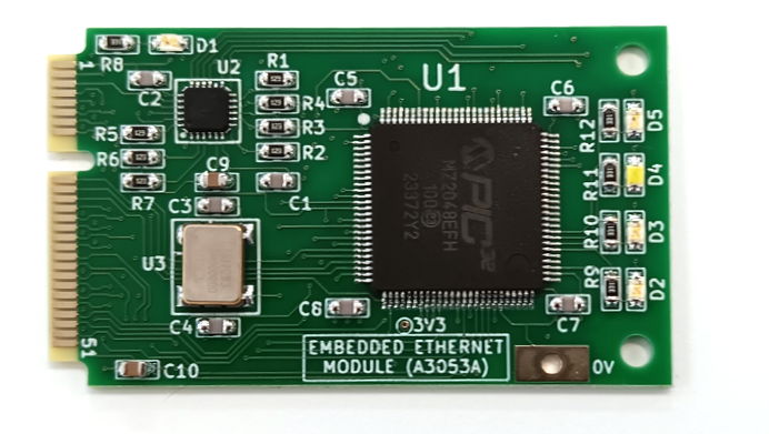[19-AUG-25] The Embedded Ethernet Module (EEM, A3053) is an Ethernet module on an Mini PCI Express (mPCIE) board. It provides and Ethernet interface, a TCP/IP stack, and thirty-five programmable input-outputs. The Ethernet interface is wired 10Base-T and 100Base-T. There is no RJ-45 socket mounted on the mPCIE card. The Ethernet connections run off the board to an external RJ-45 connector. The A3053A is currently in development, with an expected release data of January 2026. We will offer the A3053A for sale at that time. All its software will be open-source, to facilitate adoption by other users.