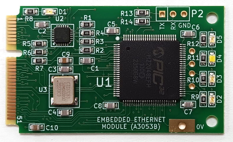 The heart of the A3053 Embedded Ethernet Module is a PIC32MZ2048EFH "Embedded Connectivity with Floating Point Unit MCU" in a TQFP-100 package. This particular variant of the PIC32MZ family is equipped with 2 MByte of flash memory and 512 KByte of random-access memory (RAM). The PIC32MZ microcontrollers use the MIPS32 M4K instruction set. The A3053 runs its PIC32MZ at 200 MHz. The TQFP-100 package provides fifty-one general-purpose input-output (GPIO) pins, of which forty are routed by the A3053 to pins on the mPCIe connector. These pin include 12-bit analog-to-digital converter (ADC) inputs, pulse-width modulated (PWM) outputs, and tri-state buffers. The PIC32MZ provides its own media access controller (MAC), but not an Ethernet physical layer. The A3053's Ethernet physical layer is provided by a LAN8720A. Also mounted on the A3053 are a 50-MHz oscillator, five LEDs, and a collection of capacitors and resistors. There are no parts on the underside of the board.