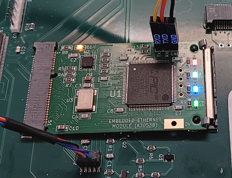 [19-MAR-26] The A3053C Embedded Ethernet Module provides seven test points. Four of these are the same signals that drive the four indicator lamps D2, D3, D4, and D5. These you will find as through-hole pads next to the resistors that feed the lamps. These four pads are unmarked on the silkscreen. The A3053C provides three more test points that connect to uncomitted GPIO pins on the PIC32MZ. These are marked on the silkscreen with their short PIC32MZ signal names. We have RC15 connecting to U1-50, RD1 to U1-76 and RD4 to U1-81.