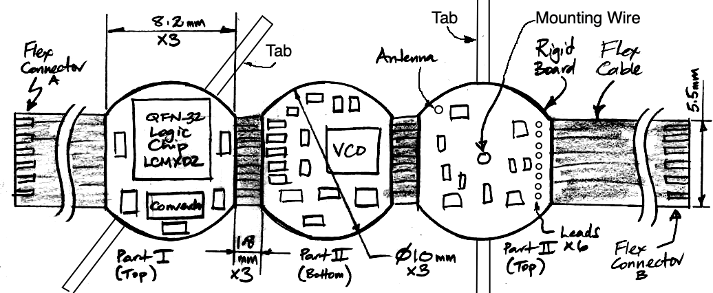 From left to right we have Section I, Section II, and Section III. Each lies within a 10-mm diameter circle and is squared off where the flex cable emerges from its side. The positive and negative battery tabs are on Section I. We tab-weld two 1.5-V SR936 1.5-V 9.5-mm diameter, 3.6-mm thick, 75 mAhr batteries together and to these two tabs to power the circuit, with the positive terminal resting on the logic chip and the negative terminal of the second battery on top. The two batteries are connected by their own tab. We cannot trust to contact to hold them together because the epoxy of encapsulation will penetrate between the two of them. Later, we fold the circuit onto itself, and secure the three layers together by tab-welding the two longer tabs on Section III to the negative terminal of the top battery.