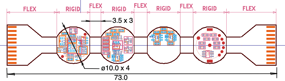 [04-FEB-26] Create web pages. Here is a sketch of the planned three-layer PCB rigid-flex circuit. The board consists of three circular sections joined by two flex cables. The flex cables between the rigid sections are just the right length so that they allow the rigid sections to fold over onto one another without leaving extra flex cable to jut out the side of the implant. On either end there are flex cables with flex connectors at the end. We use the left flex cable to power the circuit and program the logic chip. We use the right flex cable to test the amplifiers.