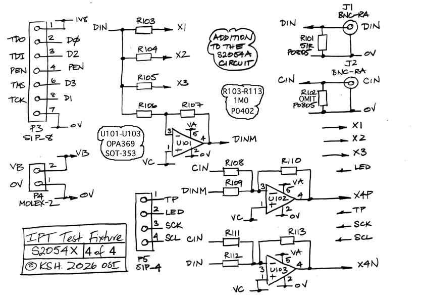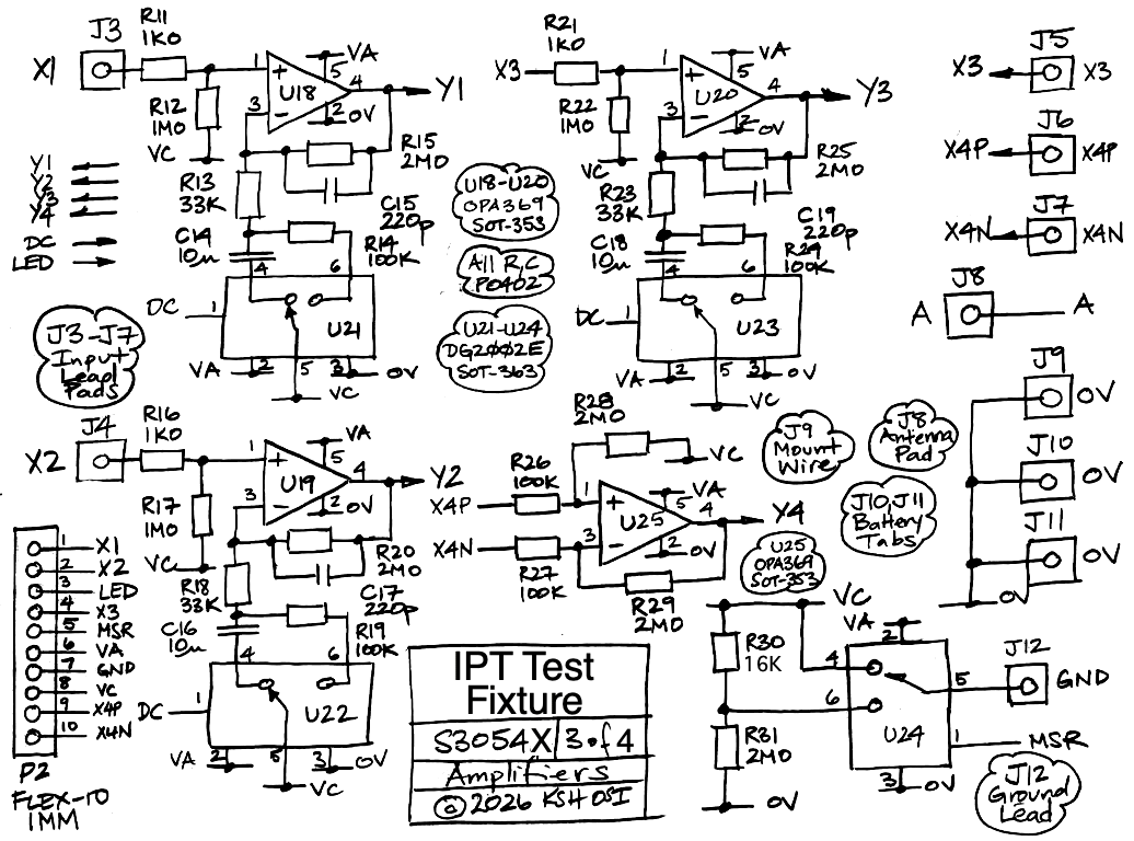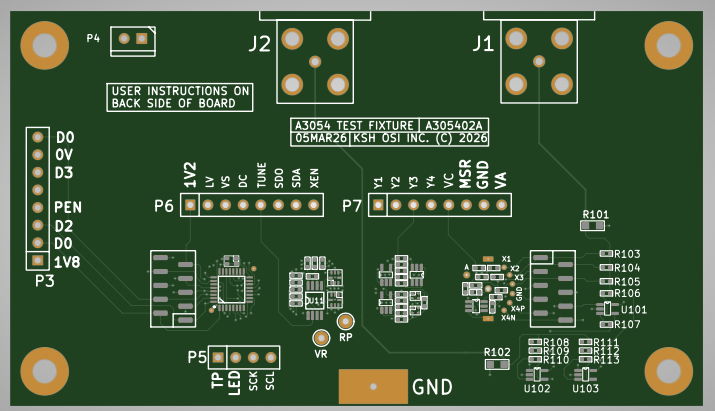 [05-MAR-26] We complete the layout of the A305402A test fixture circuit board, which we will use to build the A3054X breadboard version of the IPT and the A3054TF test fixture for programming and quality control. There are many test points on the circuit board. Those marked in the larger font are available in the test fixture version, when we plug a rigid-flex IPT into the flex sockets on the left and right. Those marked in the smaller font will be available when we build the A3054AV1 circuit on the test fixture circuit board for our first tests.
