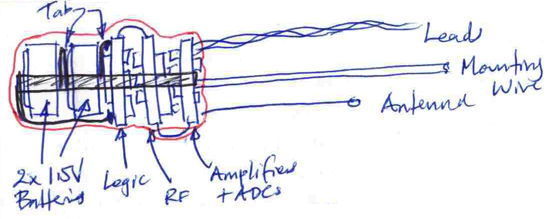 Section II will hold all RF circuits, while passing through logic signals and power for Section III. We will place near the VCO the five-bit resistor DAC required to provide the VCO's tuning voltage. Also on Section II will be the antenna switch and the crystal radio that produces the received power signal RP. The antenna matching network will be placed between the VCO and the switch, and the switch directly on the antenna.