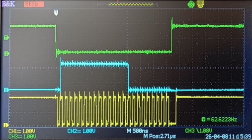 Our I2C interface is running at 5 MHz / 9 = 555 kHz when the maximum specified for the TPM117 is 400 kHz. But the sensor measurements are being read out correctly: we see 24.9°C. Here is an example of one of our SCL pulses on a single-bit read. Each instruction has the numer of CPU clock cycles next to it, and the CPU is running at 5 MHz.