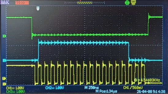 [08-APR-26] We load U12, ADS7052, the first of four 14-bit micropower converters. We connect VA to VS because we don't have the VA regulator loaded. We have nothing connected to the ADC input. We read the ADC and transmit. We see value 16383 = 0x3FFF. We connect the ADC input to 0V with a 10-MΩ probe and the value drops to zero. The ADC readout is shown below for 0x3FFF. The readout is driven by FCK at 10 MHz. We have SCK and !ADC1 HI during idle. At the start of the readout, !ADC1 goes LO. After 100 ns, SCK goes LO as well, and SCK proceeds to run at 5 MHz for 17 rising edges, then goes LO. We see the ADC producing a 0 on SDO until the first rising edge on SCK, fourteen 1s on the first fourteen rising edges, and three zeros on the final three rising edges. Now SCK remains LO and !ADC1 goes HI. Not seen in the picture is SCK going HI again some a little later. The entire readout takes 3.3 μs.
