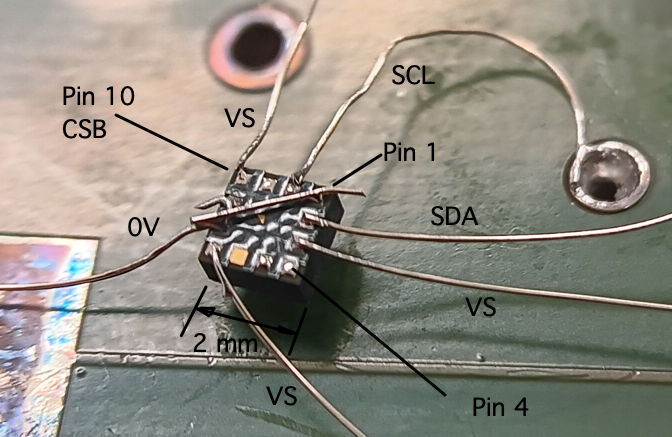 We load U6, the BMA423 accelerometer. We spend the day trying to get it to respond to our I2C bus. For a few seconds it responds at one point, then stops. We conclude that the device is not configuring for I2C because we failed to tie U6-10 CSB to VDD. The data sheet says that we can leave this pin "VDDIO or NC (float)" to get I2C instead of the SPI interface, but recommends we connect it to VDDIO. In their application circuits, CSB is connected to VDDIO for I2C. So we solder 125-μm bare silver wires to one of the devices and make three connections to 0V, three connections to VS, and connect SCL and SDA as well.