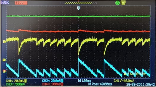 [23-FEB-26] We are estimating the current consumption of the A3054. Suppose we digitize and accumulate samples from all four fourteen-bit ADCs at 1024 SPS. We now have instant boost and un-boost with FCK running for an average of 4 μs after we un-boost. We can ignore FCK current consumption outside the time required for completion of the interrupt. Using FCK to read out the ADCs, we can obtain a 14-bit sample in no more than 20 FCK cycles, or 2 μs. We estimate no more than 25 TCK clock cycles to read the sample and add to its 18-bit accumulator in RAM. We might be adding up to sixteen samples before transmitting. We use IX and IY to accelerate read and write. We have TCK = 5 MHz so that's 5 μs to read and accumulate. The read initiates the next conversion in the ADC. The ADC itself consumes 1 mA at 1 MSPS, so 1.0 μA at 1024 SPS. We have 7 μs of CPU in boost, consuming 1.2 mA from 1V2. With our 80% efficient converter, battery at 3.1 V, and 1V2 = 1.02 V, current from battery is 1.02 V / 3.1 V / 80% = 41% of 1V2 current. So our 1.2 mA is 490 μA from the battery. We need this current for 7 μs per sample per second, so 7 μs * 490 μA * 1/s = 3.4 nA/SPS = 3.5 μA to support 1024 SPS. Each active channel requires 1.0 + 3.5 = 4.5 μA for sampling.