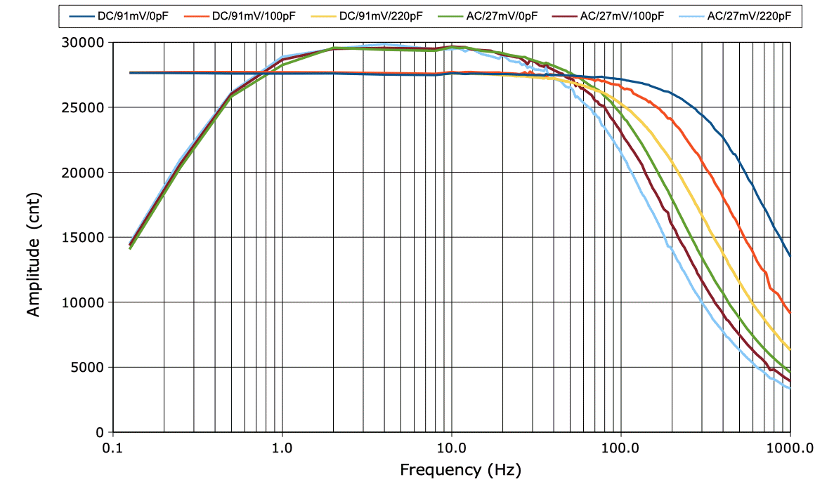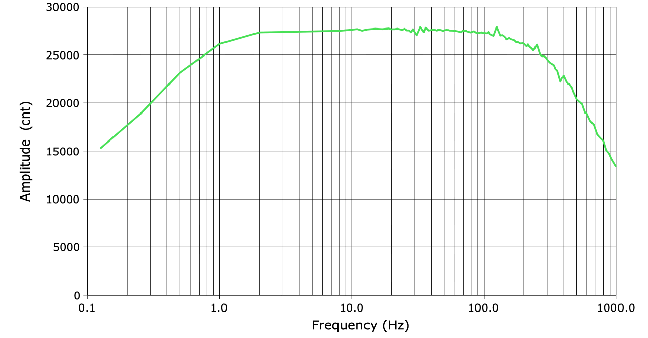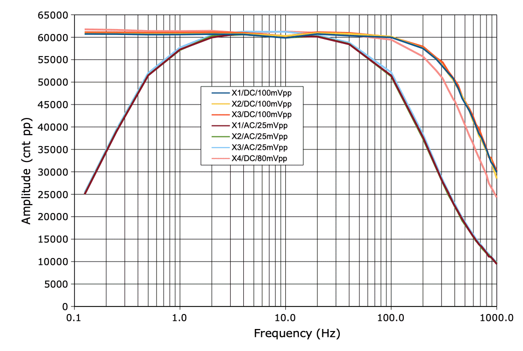We have no low-pass filter capacitors on our opamp feedback resistors. All low-pass corners are due to the OP369 itself, and are a frequencies inversely proportional to gain. We have adjusted the input amplitudes so that the amplifier output in the center of the pass band is close to 60 kcnt peak-to-peak for all of channels and configurations. The half-power frequency, which is a traditional measure of corner frequency for low-pass filters that roll off gradually, is the frequency at which the amplitude drops to roughly 42 kcnt pp. The AC-coupled X1-X3 have their corner at 160 Hz, the DC-coupled X1-X3 at 640 Hz, and the DC-coupled differential X4 at 500 Hz.
