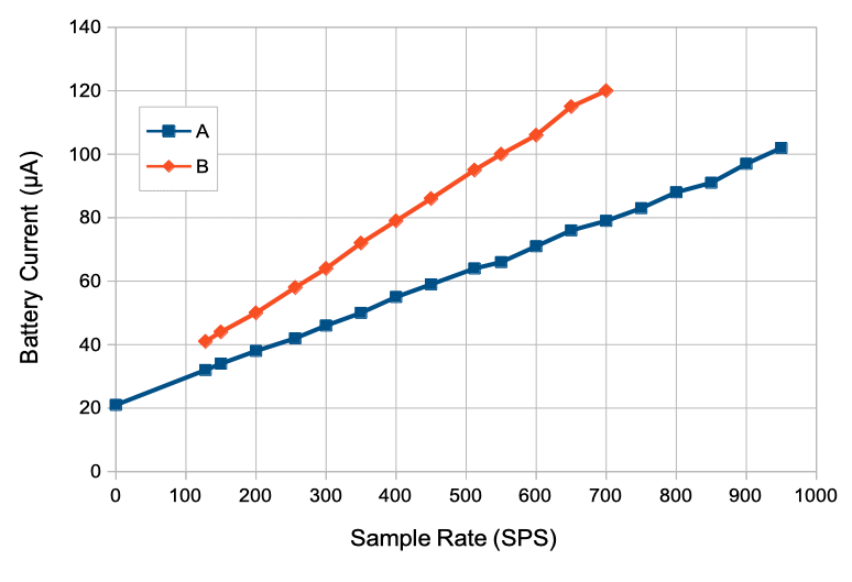 Suppose we have one active channel at 256 SPS, our current is 53 μA, which is a little over the 48 μA maximum of the A3048S2. But here we are going to be adding four 14-bit samples to obtain a very fine 16-bit sample, far superior to the spikey sixteen-bit samples we obtain from the A3048. Now suppose we have two active channels at 512 SPS. Our current is 115 μA, which is less than the 22 + 1024 * 0.11 μA/SPS = 135 μA of the equivalent A3049 two-channel circuit.