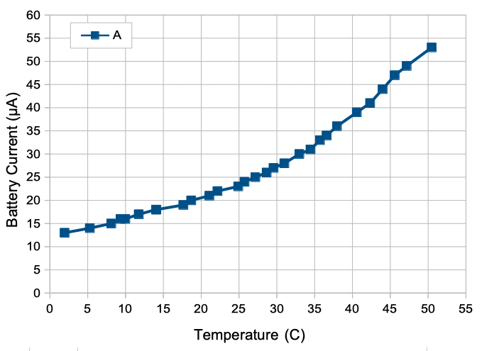Our A3054X is consuming 32 μA while transmitting 110 SPS and calculating a square for each sample. We remove the multiplication and instead just increment a register and transmit in place of both low and high bytes of the sample. With the removal of the multiplications, current consumption drops from 32 μA to 28 μA while sample rate remains 110 SPS. Each multiplication costs 36 nC from the battery. We increase sample rate to 185 SPS and current increases from 28 μA to 35 μA. The transmission cost is 0.093 μA/SPS. Extrapolating back to 0 SPS, the static current consumption at 25°C is 18 μA. P3054 commit 0b346e2.