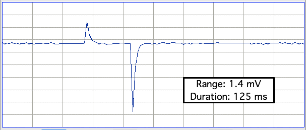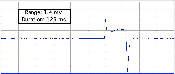 We decrease the power to 50%. Now the lamp current is being modulated during the pulse. This modulation creates an additional new 140-μV pedestal artifact during the pulse.