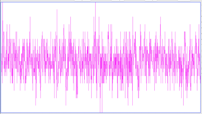 We note that MSR and DC are not being set by our code, so we drive them LO, selecting AC coupling and GND connected to VC. We reprogram. With bench power 3.0 V quiescent current is 29 μA at 25°C. In our Faraday cage, running off a battery, we see 252 SPS and 7.5 cnt rms noise. The gain of our amplifier is ×62. Our VA = 1.82 V. Our input dynamic range is 30 mV. This 7.5 cnt is 3.4 μV rms. In the Neuroplayer, we filter 1-80 Hz and see 2.5 μV noise. In the noise we see traces of quantization, but no spikes. The spectrum is flat. In the noise sample below, we receive 251 samples, so fill in 5 to make 256. But there are more than five places where the signal stays at the same value from one sample to the next. These flat segments are quantization artifact.