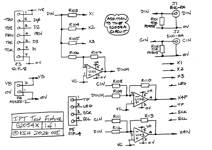 In addition to a programming plug for the logic chip, a power plug for bench-top or battery power, and numerous test points, the test fixture provides two BNC sockets for delivering a differential signal and a common-mode signal to the A3054 amplifiers. These are DIN and CIN on the schematic S3054X_1.gif. We terminate DIN with 51 Ω and deliver through 1.0 MΩ to X1, X2, and X3, where the input impedance of 1.0 MΩ will divid the terminated signal by two. We take DIN and invert it with respect to VC. We assume that we will be delivering DIN, the differential input, with an offset of VC = 0.90 V, which we can do easily with our analog signal generator. We now have DINM and DIN, a differential signal about VC. We shift both of them downwards by CIN-VC and connect them to X4P and X4N. Now we can apply a true differntial signl to X4P and X4N as well as a true common mode signal, all without unplugging anything or reconnecting anything, under the control of our analog signal generator.