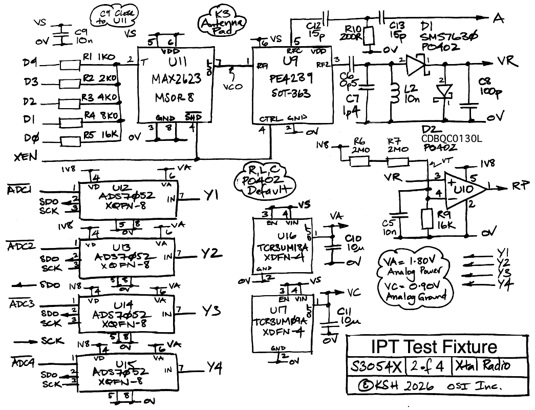 [26-FEB-26] Schematic for A3054AV1 drawn. There are twenty-one programmable pins on the LCMXO2-1200ZE in QFN-32 we are deploying on the A3054AV1 as U4. We will use all of them. Four must be shared with the programming signals TMS, TDI, TCK, and TDO. These we assign to the D0-D3 bits of our five-bit tuning DAC, on the grounds that they will be loaded by at most 2 kΩ and driving them during programming will cause no harm. The programming cable will use the JTAG Enable pin, which we call PEN, on U4-26, to switch these outputs from their programmed to their programming functions. We have nineteen pins that are necessary for the functioning of the IPT and we use the two remaining pins for an indicator lamp, signal LED, and at test point, TP. The LED and XEN signals must be 3-V logic, so we assign these to IO Bank 3, which provides exactly two pins, and power VCC3 with VS ≈ 3.0 V, the switched battery voltage. The other three IO banks we power with 1V8 = 1.8 V. The core VCC we provide with 1V2 = 1.20 V on startup and later with the assertion of LV becoming 1.0 V.