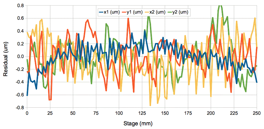 Figure: ICX424 BCAM Non-Linearity Across Entire Field of View. Pixels 7.4 μm square. Residuals in microns on sensor plotted versus stage position. Image sharply-focused. Two red lasers at 3.1 m on 300-mm stage, camera focal range 3 m, lens focal length 48 mm, camera V0359. Repeat with poorly-focused spot residuals remain 0.2 μm rms.