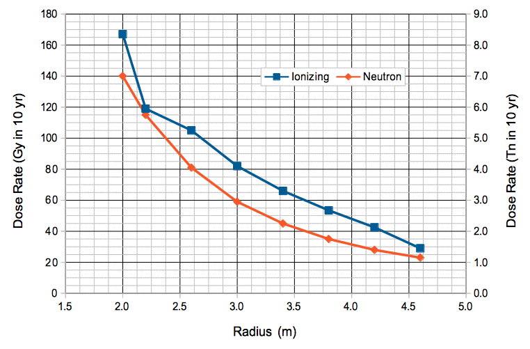 - Maximum expected radiation dose in SW was 20 Gy and 1.0 Tn.