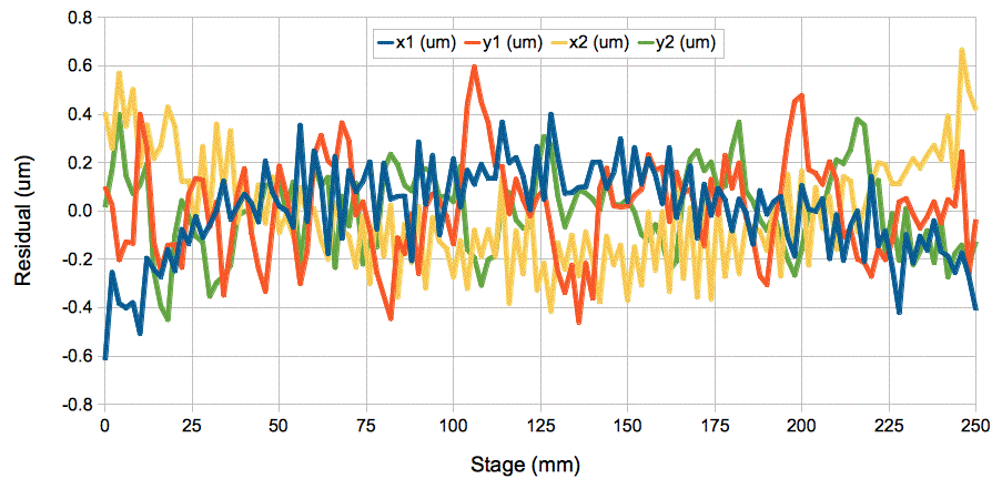 Figure: ICX424 BCAM Non-Linearity Across Entire Field of View. Pixels 7.4 μm square. Residuals in microns on sensor plotted versus stage position. Image sharply-focused. Two red lasers at 3.1 m on 300-mm stage, camera focal range 3 m, lens focal length 48 mm, camera V0359. Repeat with poorly-focused spot residuals remain 0.2 μm rms.