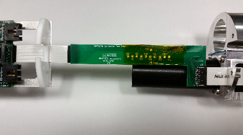 The A208202B is an extension arm for the Bar Head camera cables. It has several test points on either, which should be covered with a wrap of Kapton (or equivalent) non-conductive tape. The placemnet of the connectors on the L-Board is compatible with the CCD station and can be used to ensure that the CCD stations are mounted in the proper orientation. The L-Board is attached to the Bar Head and the CCD heads by 2" (5.08 mm) FLEX-12 cables.