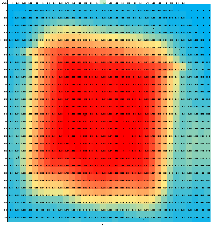 This shows a heat-map style chart to show the bright and dark sections of many seperate LEDs. Some patterns are common, such as dark stretches through their centers, but each LED shows a distinct and unique distribution of power output. The differences in intensity output between the brighter and darker patches in similar structures vary as well. The first image above shows the intensity profile of an LED with a dark stripe directly through the middle, as well as large variations in intensity along the top left corner. The second image shows little variation from one point to the next throughout the center. In the first image, the dark stripe through the middle only emits about 35% of the maximum power output at any point on that LED. Drastic differences between areas such as this above were rare, but must be accounted for.